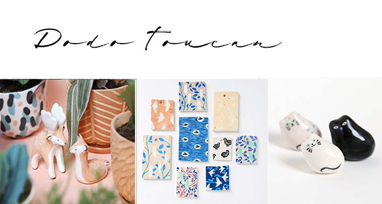 J’aime énormément les petites figurines de Dodo Toucan. Pour décorer une chambre d’enfants ou à poser en grigri sur son bureau ces petits animaux en céramique apportent vraiment de la bonne humeur. Fabriqués à Paris dans son atelier, ses pièces varient en couleurs et en motifs. Je crois que tous les animaux y sont passés. J’aime aussi beaucoup les motifs et la forme originale de ce vase.