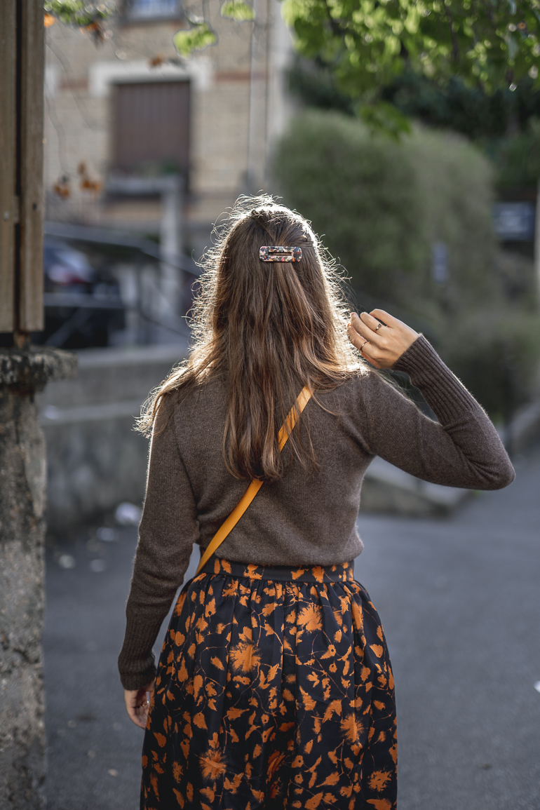 Ce sac moutarde, emblème de mes accessoires automnaux, vous l’aviez déjà vu dans ce look. La jupe boule, que je ne pensais pas si vieille, date en fait de 2016, je la portais pour la 1ère fois en tenue habillée, mais aussi ici plus printanière. Finalement avec le temps on voit les pièces différemment et certaines nous correspondent davantage avec les années. Et les petits mocassins Bobbies évidemment, un basic qui a fait son entrée dans mon dressing assez tardivement, c’est un achat de l’année dernière, je vous les montrais déjà au printemps, mais ils font partie de la collection permanente.
