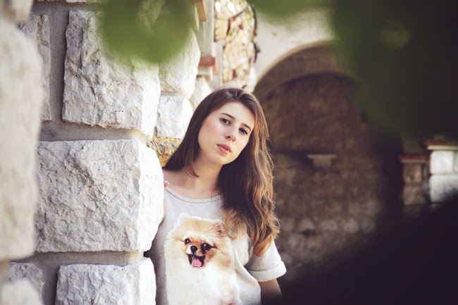 Bonjour les filles,Un shooting de vacances, dans les ruines du château de Nice avec un look très loin des tenues de touristes, avec ma jupe Claudie Pierlot et un produit local : le chihuahua !