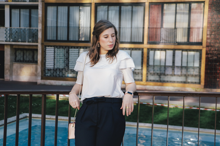 Bon j’avoue j’ai un peu de mal avec l’idée de porter des collants noirs avec un si beau soleil et pas encore envie de sortir les jambes nues, question de timing ! Le pantalon 7/8 fait donc un bon compromis. C’est tellement agréable de ressortir les tops légers ! Celui ci illustre encore bien ma passion des tops blancs romantiques. C’est le top Beauvoir de chez Claudie Pierlot. Son nom aussi m’avait bien emballée, parce que c’est quelque chose à laquelle je fais attention, ça donne une âme à un vêtement je trouve. Vous aussi vous faites attention au nom des modèles ?